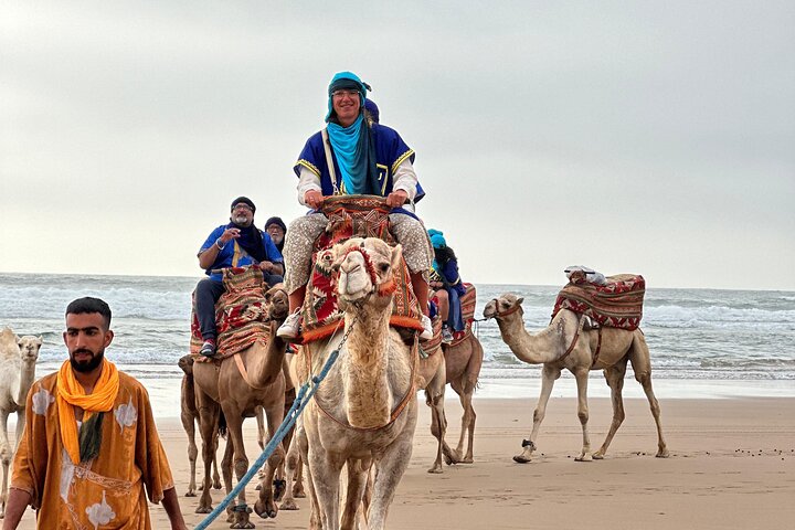 The Sunset Camel Ride and Beach Barbecue Adventure from Agadir offers a unique blend of experiences. Enjoy a scenic drive through charming surf villages and colorful coastal towns. Ride a camel through lush banana fields dressed in traditional nomad clothing. Witness a breathtaking sunset at Tamri Beach, then savor a delicious barbecue dinner. This adventure combines cultural immersion, natural beauty, and culinary delight, all with convenient round-trip transportation from Agadir and Taghazout.